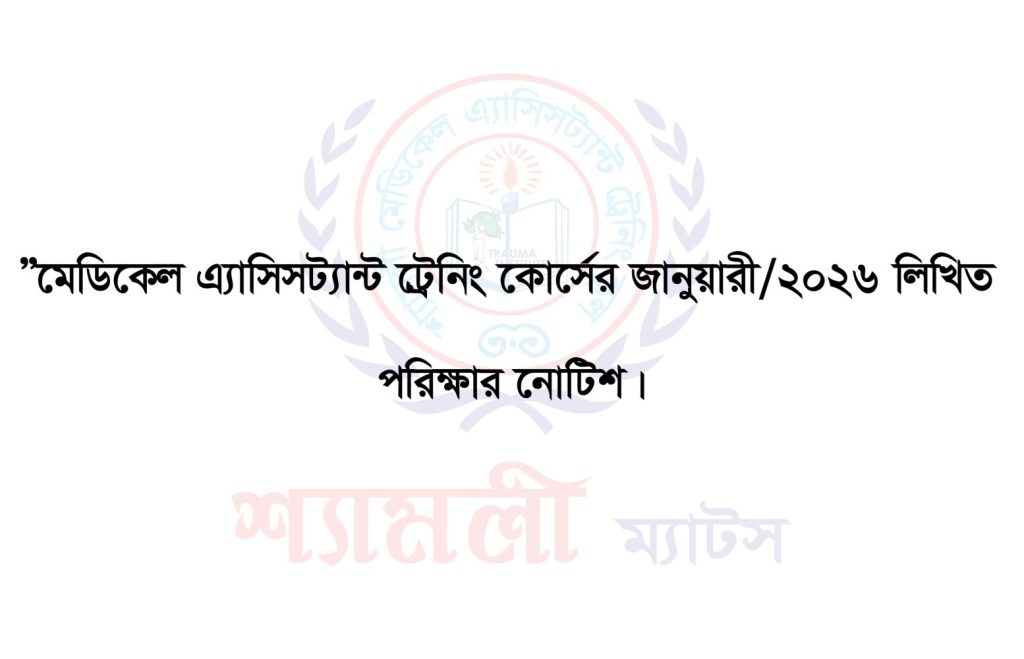 মেডিকেল এ্যাসিসট্যান্ট ট্রেনিং কোর্সের জানুয়ারী/২০২৬ লিখিত পরিক্ষার নোটিশ।